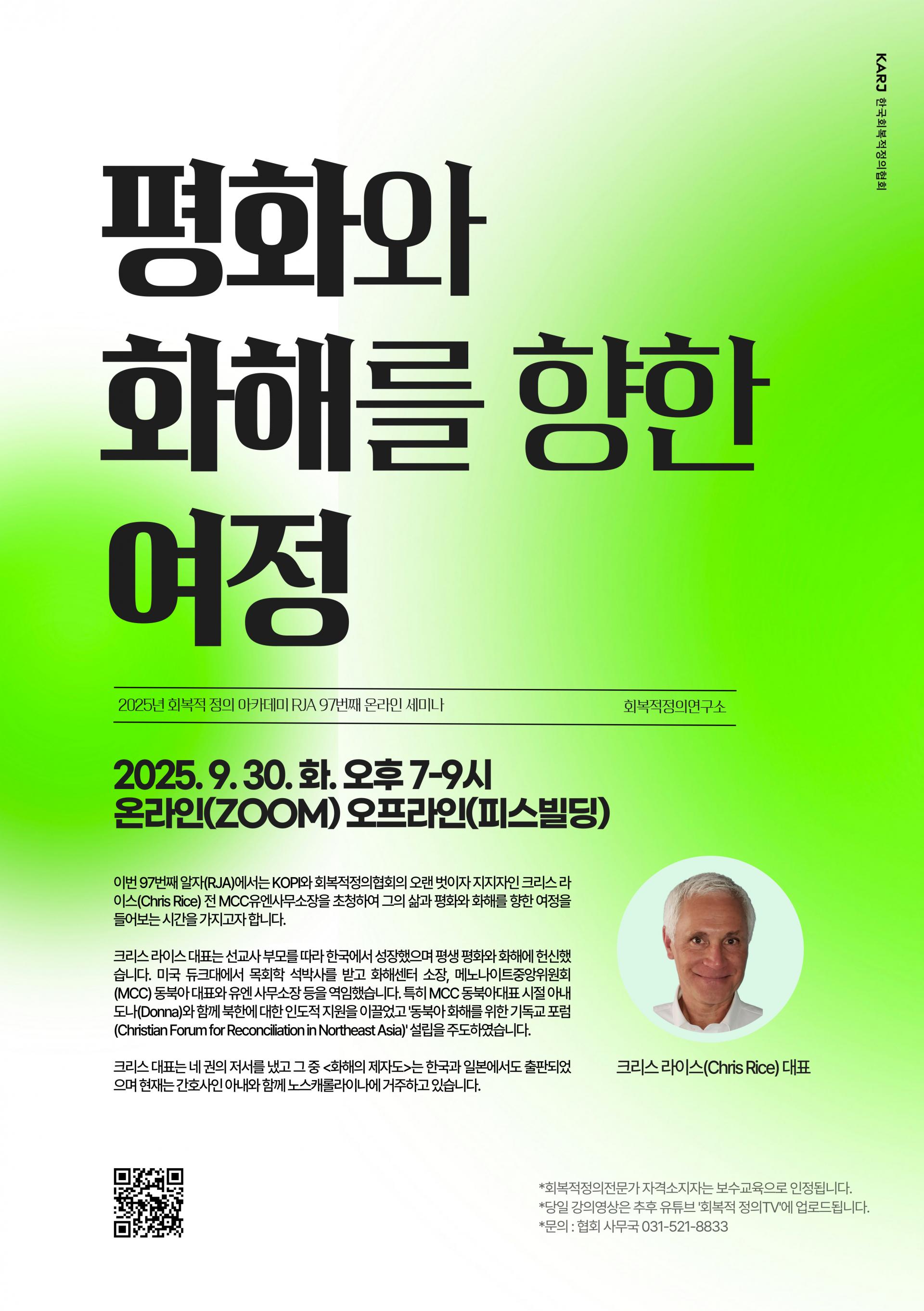 🟢 크리스 라이스(Chris Rice).크리스 라이스 대표는 선교사 부모를 따라 한국에서 성장했으며 평생 평화와 화해에 헌신했습니다. 미국 듀크대에서 목회학 석박사를 받고 화해센터 소장, 메노나이트 중앙위원회(MCC) 동북아 대표와 유엔 사무소장 등을 역임했습니다. 특히 MCC 동북아대표 시절 아내 도나(Donna)와 함께 북한에 대한 인도적 지원을 이끌었고 '동북아 화해를 위한 기독교 포럼(Christian Forum for Reconciliation in Northeast Asia)' 설립을 주도하였습니다. 그는 네 권의 저서를 냈고 그 중 <화해의 제자도>는 한국과 일본에서도 출판되었으며 현재는 간호사인 아내와 함께 노스캐롤라이나에 거주하고 있습니다.📆 일시 : 2025년 9월 30일 화요일 오후 7-9시🏡 장소 : 온라인(ZOOM)👨🏻💻 주최 및 주관 : 회복적정의연구소☎ 문의 : 031-521-8833✔ 사전 신청자에 한하여 온라인 ZOOM 링크를 드립니다.✔ 회복적정의전문가 자격 취득자분들은 보수교육으로 인정됩니다.